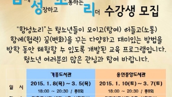 “함께 성장하고 소통하는 리더 양성해요!” 용인시도서관 2개소(용인중앙, 기흥)는 내년 1월 8일부터 3월 7일까지 매주 목요일(기흥)과 토요일(용인중앙)에 관내 중고등학생을 대상으로 소통리더십 프로그램 ‘함성소리’를 운영한다. ‘함성소리(함께 성장하고 소통하는 리더)’는 청소년들이 단체활동을 통해 소통리더십을 개발하는 인성교육프로그램이…