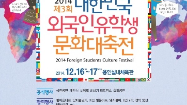국내 대학에서 공부하는 외국인 유학생들의 대향연 ‘2014 대한민국 외국인유학생 문화대축전’이 16일(화)과 17일(수) 용인시 실내체육관에서 열린다. 이 행사는 고국을 떠나온 유학생들을 격려하고 한국사회와의 교류·우호를 돕는 소통의 장으로 올해 3회째 열리는 축제다. 경기관광공사 주최로 경기관광공사와 경인일보사가 주관하며 외교부, 교육부, 문화체육관…