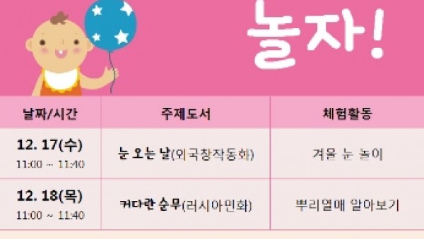 그림인형으로 책읽는 놀이 ‘패널 시어터’ 체험하세요 용인중앙도서관은 12월 17일과 18일 오전 11시부터 약40분 동안 어린이도서관 시청각실에서 영유아 대상 독서프로그램 ‘엄마랑 아가랑 그림책과 놀자’를 운영한다. 모집인원은 영유아(24개월~48개월)와 보호자 선착순 20쌍이며, 참가신청은 12월 3일 오전 9시 30분부터 도서관 홈…