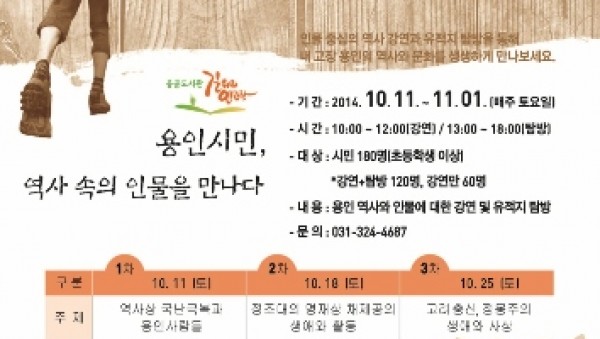 -용인역사 속 인물 강연․탐방 15일부터 180명 참가자 모집- 용인중앙도서관은 10월 11일부터 11월 1일까지 매주 토요일 공공도서관 길 위의 인문학 ‘길 위에서 만나는 우리 역사’ 프로그램을 운영하기로 하고 오는 15일부터 참가자를 모집한다. ‘공공도서관 길 위의 인문학’은 문화체육관광부 주최, 한국도서관협회 주관으로…