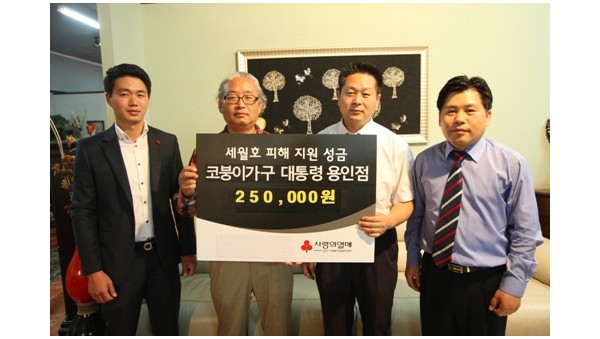 경기사회복지공동모금회(회장 최신원)는 11일(수) 용인시 코붕이가구대통령을 방문하여 세월호 피해지원 성금 25만원을 전달받았다. 금번 코붕이가구대통령 용인점에서 기탁받은 성금은 단품된 새 가구를 천원에 구매할 수 있는 이벤트를 마련하고, 참가비 천원을 모아 마련됐다. 이날 전달식에서 한회철 코붕이가구대통령 사장은 “뉴스를 통해 …