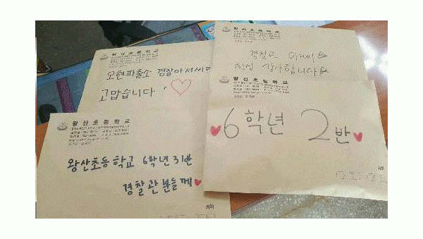용인동부경찰서 모현파출소(소장 박광식)는, 지난 제71회 경찰의 날을 맞아 왕산초등학교 학생들이 경찰관에게 직접 손으로 쓴 편지를 전달받았다. 편지는 6학년 1,2,3,4반 학생들이 쓴 것으로 평소 교통지도 및 등하굣길 아동안전에 힘써주신 경찰아저씨들에게 감사하다는 내용이었다. 한 학생은 ‘경찰아저씨들처럼 힘든 직업은 많이 없을 것 같아요. 주말, 명절…