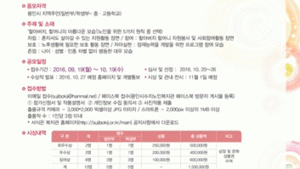 용인시수지노인복지관(관장 김현숙)은 ‘할아버지, 할머니의 아름다운 모습’을 주제로 노인 인권 증진을 위한 사진 공모전을 실시한다. 응모자격은 용인시에 거주하는 지역주민으로 일반부 및 중・고등부를 대상으로 오는 10월 19일(수)까지 접수를 받는다. 공모주제는 노인을 위한 5가지 원칙인 자립, 참여, 보호, 자아실…