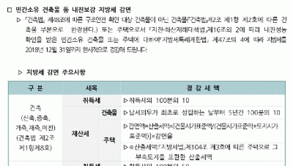 - 용인시, 내진보강시 재산세‧취득세 10~50% 감면 - “내진 보강하면 취득세와 지방세를 감면해 줍니다.” 최근 경주지역에 잇따라 지진이 발생함에 따라 용인시가 민간건축물에 대해 내진 보강을 적극 유도하고 나섰다. 우리나라도 지진 안전지대가 아니라는 경고가 나오고 있어 내진설계 및 보강을 적극 권장하기 위해서다. &n…