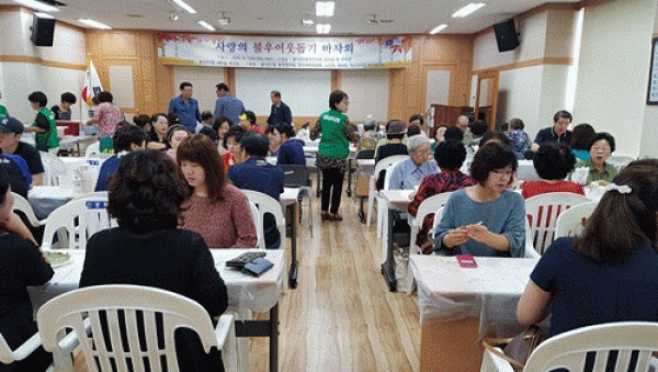 용인시 수지구 풍덕천2동 새마을부녀회는 지난 7일 주민센터에서 6개 유관단체 회원들과 주민 300여명이 참여해 불우이웃돕기 바자회를 열었다고 밝혔다. 이날 바자회는 포도, 참깨 등 농산물을 비롯해 참기름, 멸치, 고춧가루 등 지역 특산물을 저렴하게 판매했다. 새마을부녀회에서는 육개장, 떡, 전 등을 나누는 먹거리 장터를 운영했으며 헌옷, 구두 등을 기…