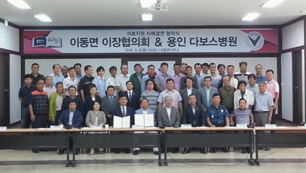 용인시 처인구 이동면은 건강한 지역사회 조성을 위해 지난 6일 이장협의회와 김량장동 다보스병원이 자매결연 협약을 체결했다고 밝혔다. 협약을 통해 병원은 마을주민들이 병원시설을 이용할 때 편의 제공과 혜택을 주고 이장협의회 추천시 불우가정은 수술비를 면제해 주기로 했다. 또 양측이 각종 행사와 봉사활동에 공동으로 참여하고 마을회관 방문진료 등에 서로 협…