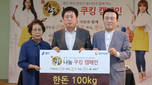 한돈자조금관리위원회는 지난 17일 용인시 이동면 천리 용인종합사회복지관에서 ‘한돈 나눔 요리 캠페인’을 통해 용인새마을회 무료급식소에 돼지고기 100㎏(시가 200만원 상당)을 기증했다. 한돈 나눔 요리 캠페인은 대한한돈협회가 여성 한돈인 봉사단과 함께 지난달부터 10월까지 전국을 돌며 지역사회의 보육시설이나 양로원 등 저소득층에 한돈으로 …