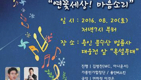 (재)용인문화재단(이사장 정찬민)은 용인 원삼면에 위치한 문수산 법륜사에서 오는 8월 20일 오후 7시 ‘2016 용인시민과 함께하는 산사음악회-연꽃세상! 마음소리’를 개최한다. 문수산 법륜사 대웅전 앞 야외특설무대에서 펼쳐지는 이번 무대는 연꽃의 그윽한 향과 감미로운 음악선율이 한데 어우러져 특별한 분위기를 자아낼 것이다. 김…