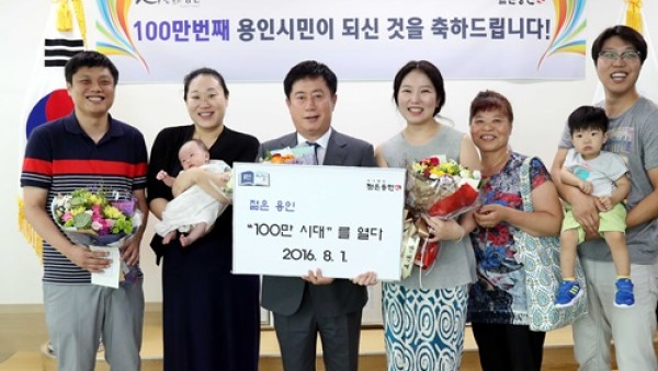 ▲ 좌로부터 윤태영씨-이진희씨,아기 윤예준-정찬민시장-상갈동의 김경하씨가족 (사진15시30분경제공) 용인시 총인구(내국인+외국인)가 1일 오후 4시45분 기준으로 100만명을 돌파했다. 이에 따라 용인시는 수원시(122만명), 창원시(108만명), 고양시(104만명)에 이어 전국에서 4번째로 100만명을 넘는 기초 지방자치단체가 됐다. 용…