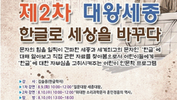용인시 수지도서관은 인문학의 대중화를 위해 실시하는 ‘길 위의 인문학’ 프로그램으로 ‘대왕세종, 한글로 세상을 바꾸다’를 운영키로 하고 2일부터 참여자를 모집한다고 밝혔다. ‘길 위의 인문학’ 강좌는 재미있고 유익한 인문학 프로그램을 통해 인문학의 대중화와 독서문화를 확산시키기 위해 실시하는 것으로 참가비는 무료다. 이…