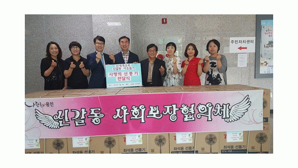 용인시 기흥구 신갈동은 11일 관내 신세계교회로부터 저소득 주민에게 전달해 주도록 선풍기 30대를 기증받았다고 밝혔다. 이번 행사는 신세계교회 신도들이 여름철을 맞아 더위에 취약한 관내 저소득 주민들이 폭염에 대비할 수 있도록 하기 위해 마련한 것이다. 동 관계자는“무더위에 취약한 저소득 주민들이 건강한 여름을 보낼 수 있게 도와 …