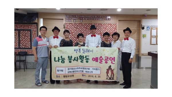 용인신리초 댄스스포츠교원연구회 죽전엘림요양원 나눔의 봉사활동 용인 신리초등학교(교장김오영)에서 마을공동체 사업으로 진행되고 있는 댄스스포츠 평생교육팀은 25일 죽전에 있는 엘림 요양원에서 요양 중인 어르신들과 운영진을 위하여 예술 공연을 하였다. “행복릴레이 나눔 봉사활동 예술공연”을 주제로 …