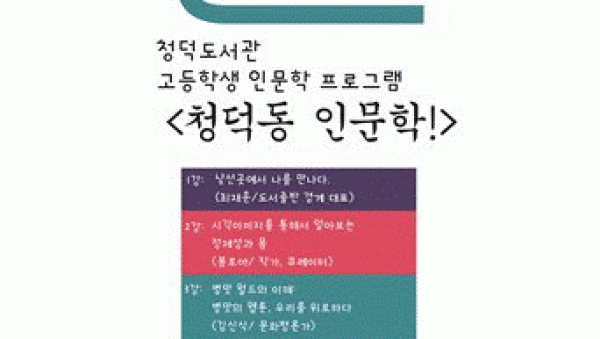 (재)용인문화재단(이사장 정찬민)은 고등학생을 위한 인문학 프로그램인 ‘청덕동 인문학!’을 6월 25일(토)부터 11월 26일(토)까지 매월 넷째 주 토요일 오전 10시에 청덕도서관에서 총 6회에 걸쳐 진행한다. ‘청덕동 인문학!’은 청덕도서관에서 준비한 첫 번째 인문학 프로그램으로 지역 고등학생들에게 다양한 분야의 인문학을 소개하고, 아울러 도서관의 …