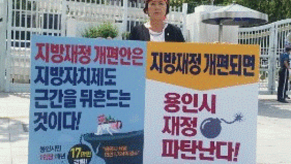 용인시의회(의장 신현수) 의원들은 8일 오후 행정자치부 앞에서 지방재정개편 반대 릴레이 1인 시위를 이어갔다. 이날은 김상수, 이정혜, 김선희, 이건영 의원이 릴레이 1인 시위에 동참해 지방재정 개편안의 문제점을 지적하고, 헌법에 규정된 지방자치제도의 정신을 훼손하고 자치재정의 하향평준화를 초래하는 지방…