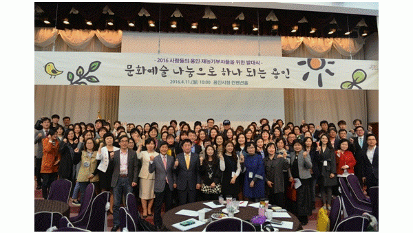 (재)용인문화재단(이사장 정찬민)은 2016년 4월 11일 용인 시민들을 위해 문화예술 재능을 나누고자 한 자리에 모인 ‘문화예술 재능기부자들을 위한 발대식’을 용인시청 컨벤션홀에서 개최했다. 본 행사에는 용인문화재단 <시민모니터링단>20여 명과 <마당지기 예술교육 재능기부단> 100여 명이 함께 참여하였으며, 2016년 활동을 시…