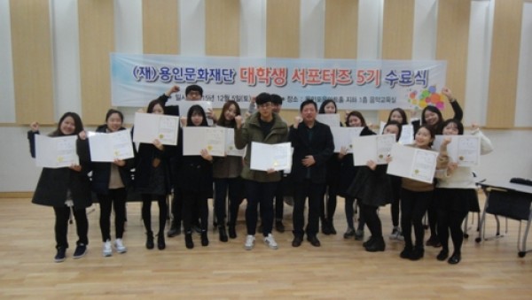 (재)용인문화재단은 지난 12월 5일 용인포은아트홀 음악교육실에서 대학생 서포터즈 5기의 수료식을 진행했다. 이번 대학생 서포터즈 5기는 2015년 9월부터 12월까지 총 18명의 대학생으로 구성되어 활동했으며, 재단의 공연, 전시, 축제 등에 참여함은 물론 시민에게 다양한 문화예술 정보를 접할 수 있도록 개인 및 재단이 운영하는 SNS 등에 재단 …