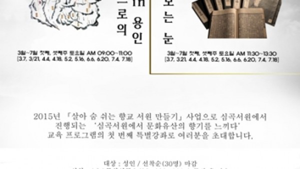 - 특별강좌 ‘문화유산으로의 초대 in 용인’, ‘고문헌을 보는 눈’ 개최 용인시는 지난해에 이어 2015년 문화재청 공모사업 ‘살아 숨쉬는 향교ㆍ서원 활용사업’으로 선정된 심곡서원에서 ‘문화유산의 향기를 느끼다”란 주제로 심곡서원 활용사업을 3월부터 시작한다. &…