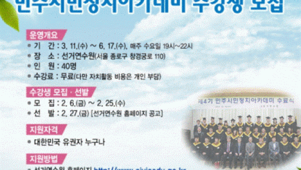 중앙선거관리위원회 선거연수원은 정치·사회지도자를 양성하기 위하여 「제5기 민주시민정치아카데미」 수강생 40명을 모집한다고 밝혔다. 민주시민정치아카데미는 4개월 과정으로 매주 수요일 야간 무료강좌로…