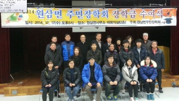 용인시 처인구 원삼면주민장학회(이사장 윤재룡)의 2014년 장학금 수여식이 지난 17일 원삼면사무소 대회의실에서 지역주민 50여명이 참석한 가운데 열렸다. 장학회는 학업과 생활에서 모범을 보인 중학생 4명(각3…