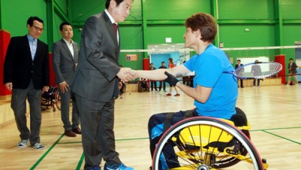 정찬민 시장, 실내배드민턴장서 장애인과 시범경기