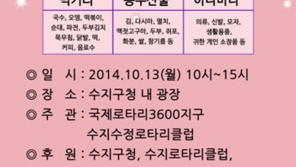 수지수정로타리클럽, 수지구 저소득 장애인을 위한 사랑나눔바자회 실시 어느덧 무더운 여름이 자취를 감추고 높은 하늘, 시원한 바람과 함께 천고마비의 계절 10월이 성큼 다가왔다. 오는 10월 13일(월)에 수지구청 광장에서는 수지구 저소득 장애인의 따뜻한…