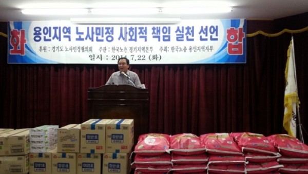 한국노총 용인지역지부(의장 김완규)는 7월 22일 오후2시에 한국노총 대회의실에서 용인지부 대표자회의를 갖고 노.사.민.정이 참석한 가운데 용인시 노사민정 사회적 책임실천대회를 갖고 용인시에 거주하고있는 어려운 탈북민들에게 물품기탁 행사를 갖었다. …