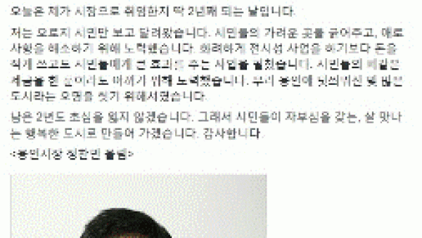 - “용인에 사는게 자부심 느낀다“는 감사편지 에피소드 소개 - . 정찬민 용인시장이 취임 2주년을 맞아 자신의 페이스북에 한 시골 어르신으로부터 감사편지를 받은 에피소드를 소개하며 시정에 대한 철학을 밝히는 글을 올려 눈길을 끈다. …