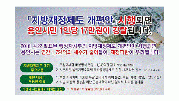 - 25일 ‘용인시민 세금지키기 운동본부’ 구성해 궐기대회 개최 - - 시민 서명운동과 주민설명회 등 통해 공동 대응 나서 - “지방재정제도 개편안이 시행되면 용인시민 1인당 17만원을 강탈당합니다.” &…