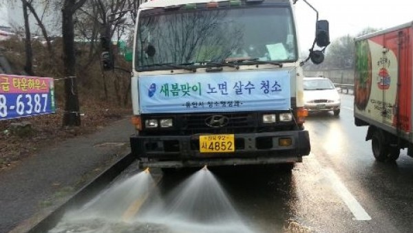 노면살수 청소차량 봄맞이 도로 물청소 나서