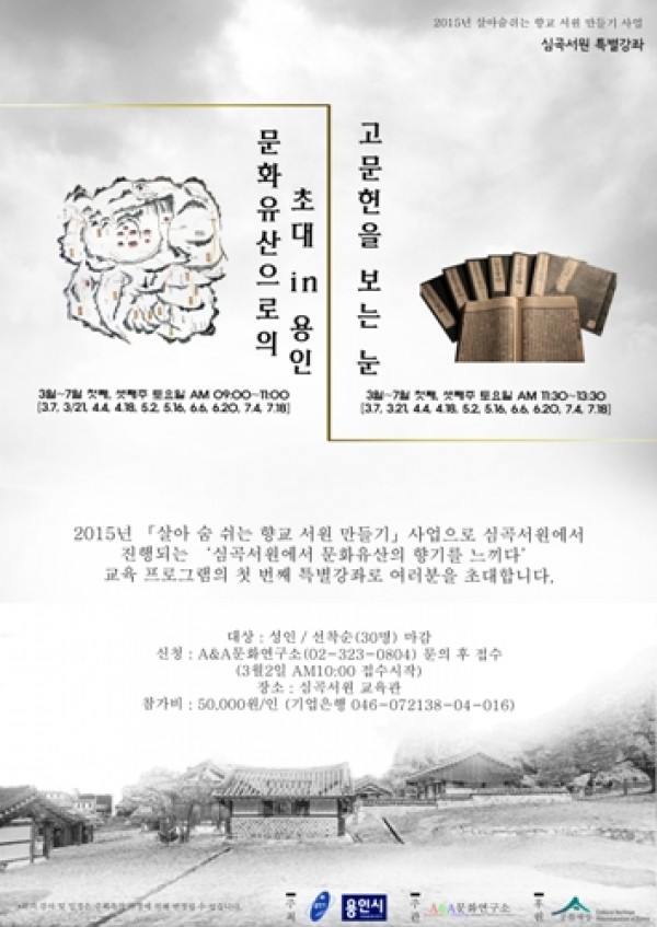 - 특별강좌 ‘문화유산으로의 초대 in 용인’, ‘고문헌을 보는 눈’ 개최 용인시는 지난해에 이어 2015년 문화재청 공모사업 ‘살아 숨쉬는 향교ㆍ서원 활용사업’으로 선정된 심곡서원에서 ‘문화유산의 향기를 느끼다”란 주제로 심곡서원 활용사업을 3월부터 시작한다. 오는 3월 7일부터 시작되는 강좌는 심곡서원 특별강좌로 ‘문화유산으로의 초대 in 용인’과 ‘고문헌을 보는 눈’이라는 큰 테마하에…