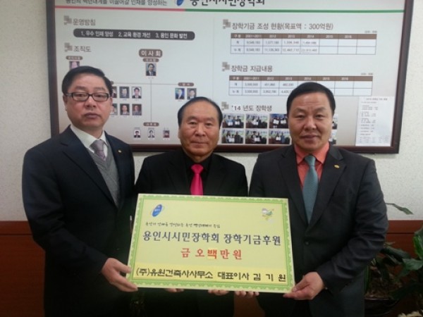 용인시 유원건축사사무소(대표이사 김기원)가 6일 용인시시민장학회에 장학금 500만원을 기탁했다. 유원건축사사무소는 기업 이윤의 사회적 환원을 위해 지난 2013년에 용인시시민장학회에 300만원의 장학금을 기탁하고 매년 300만원의 장학금을 기탁하기로 협약을 맺은 기업이다. 2014년에도 장학금 기탁 약정…