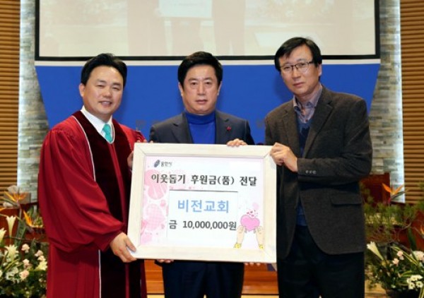 용인비전교회는 이웃돕기 ‘사랑의 열차 이어달리기’ 운동에 동참, 어려운 이웃을 위해 사용해달라며 성금 일천만원을 용인시에 기탁했다. 이날 기탁식에서 용인비전교회 신용수 목사는 “작은 정성이지만 경제적 어려움에 처해 있는 소외이웃들에게 힘이 되길 바란다”고 말했다. 정찬민 용인시장은 “소중한 성금을 유림동과 용인지역 저소득층 지원을 위해 유익하게 사용…