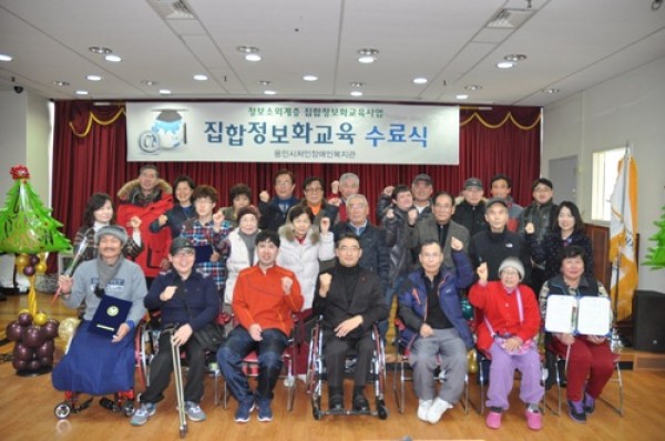 용인시처인장애인복지관(관장 정의철)은 24일, ‘2014 정보소외계층 정보화교육기관’으로 정보화교육에 취약한 장애인 및 장애인 가족에게 8월부터 12월까지 진행된 컴퓨터 첫걸음반, 포토샵, 멀티미디어, 스마트한 생활을 위한 대한민국 전자정부, 스마트폰 활용법 및 이용법 등 5개의 하반기 집합정보화교육 수료식을 진행하였다. 초대장만들기, 타이포그래피만…