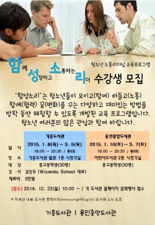 “함께 성장하고 소통하는 리더 양성해요!” 용인시도서관 2개소(용인중앙, 기흥)는 내년 1월 8일부터 3월 7일까지 매주 목요일(기흥)과 토요일(용인중앙)에 관내 중고등학생을 대상으로 소통리더십 프로그램 ‘함성소리’를 운영한다. ‘함성소리(함께 성장하고 소통하는 리더)’는 청소년들이 단체활동을 통해 소통리더십을 개발하는 인성교육프로그램이…