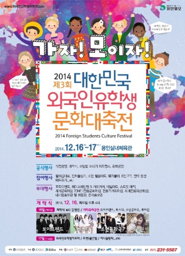 국내 대학에서 공부하는 외국인 유학생들의 대향연 ‘2014 대한민국 외국인유학생 문화대축전’이 16일(화)과 17일(수) 용인시 실내체육관에서 열린다. 이 행사는 고국을 떠나온 유학생들을 격려하고 한국사회와의 교류·우호를 돕는 소통의 장으로 올해 3회째 열리는 축제다. 경기관광공사 주최로 경기관광공사와 경인일보사가 주관하며 외교부, 교육부, 문화체육관…