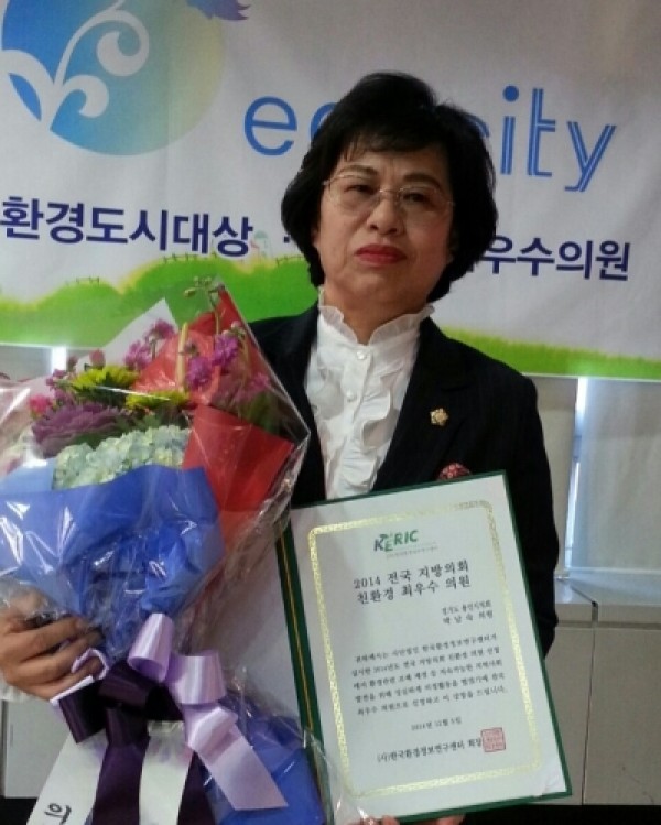용인시의회 박남숙 의원이 5일 사단법인 한국환경정보연구센터에서 발표한 ‘2014 전국 지방의회 친환경 최우수 의원’으로 선정됐다. 한국환경정보연구센터는 다양한 친환경 의정활동 중『용인시 기흥호수살리기 운동본부 설치 및 운영에 관한 조례』를 제정하는 데 기여한 공로를 인정하여 ‘친환경 최우수 의원’으로 선정했다고 밝혔다. 박남숙 의원은『…