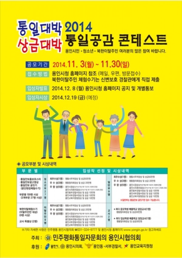 ‘민주평통‘용인시협의회(회장 황신철)가 청소년과 시민들의 통일공감대 형성을 위해 ’2014년 통일공감 콘테스트‘를 개최한다. 2014 통일공감 콘테스트는 민주평통(민주평화통일자문회의)용인시협의회 주최로 용인시·용인시의회·용인동서부경찰서·용인교육지원청의 후원으로 실시되며, 청소년(초.중.고)부와 일반부, 교사부로 나누어 실시된다. …