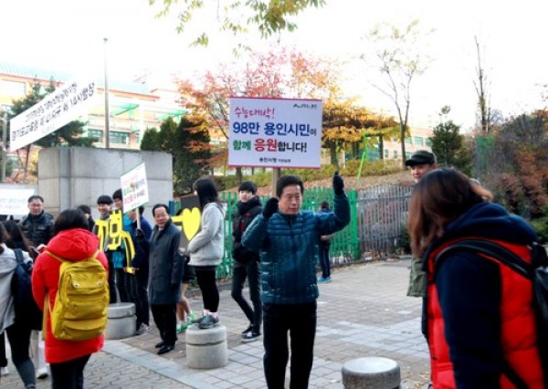 정찬민 용인시장이 13일 오전 7시경 기흥고등학교와 구갈중학교의 「2014년도 대학입학수학능력시험 현장」을 잇달아 방문, “끝까지 최선을 다 하라”며 수험생들을 격려했다. 정 시장과 용인시 공무원들은 학교 정문 앞에서 선배들에게 힘을 실어주는 후배 응원단들과 함께 “98만 용인시민이 함께 응원합니다.” “98만 용인시민이 합격을 기원합니다.” 등의 …