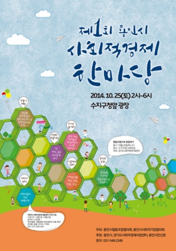 용인시협동조합협의회(회장 곽선진)와 용인시사회적기업협의회(회장 이규봉)가 공동주관하는 ‘제1회 사회적경제 한마당’이 오는 25일 오후 2시부터 수지구청 앞 광장에서 열린다. ‘사회적경제 한마당’은 협동조합, 사회적기업, 마을기업, 자활기업 등 용인지역 사회적경제기업과 시민단체 30여 곳이 기획단계에서부터 자발적으로 참여해 만든 상생과 축제의 자리다.…