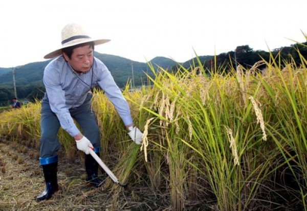 정찬민 용인시장, 친환경 쌀 벼 베기 참여