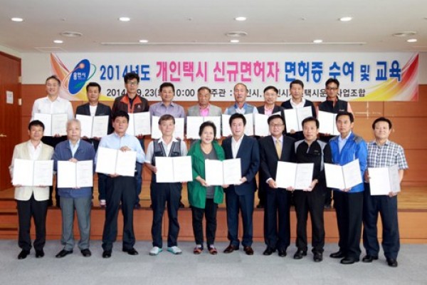 용인시는 23일 시청 철쭉실에서 2014년도 개인택시 신규면허자에 대한 면허증 수여식을 가졌다. 2014년도 개인택시 신규면허 대상자는 17명이며, 가군(택시) 12명, 나군(버스)·다군(기타사업)·라군(군관용)·마군(여성, 유공자 등) 2명이 해당된다. 시는 이와 함께 택시 서비스의 질적 향상을 위해 운송사업자로서 가져야할 친절 …