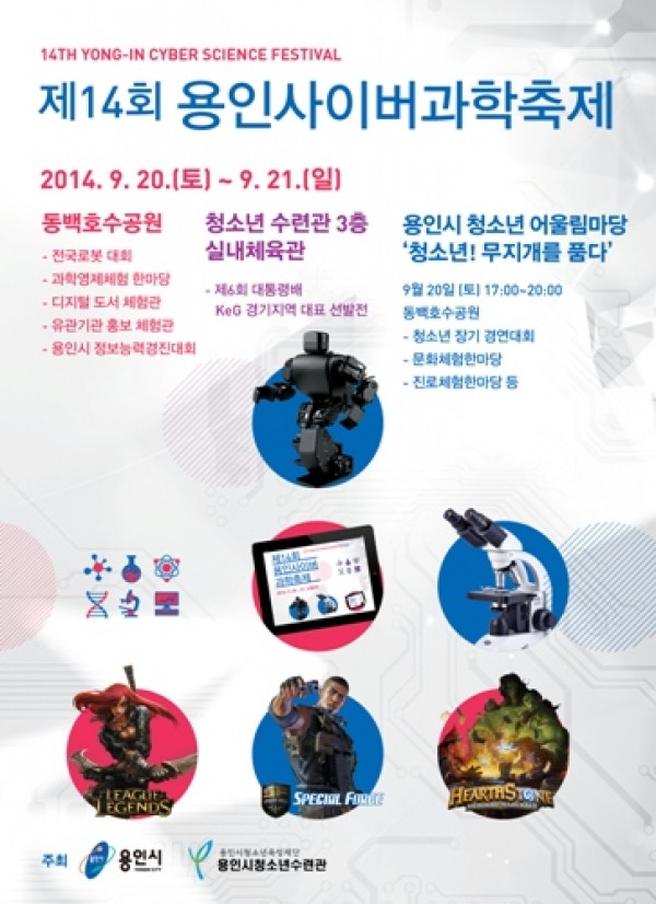 - 20일∼21일 동백호수공원, 청소년수련관 실내체육관서 개최 - 시민 화합, 지역경제 활성화 기여하는 축제 자리매김 올해로 지명탄생 600년을 맞이하는 용인시가 오는 9월 20일과 21일 동백호수공원과 청소년수련관 실내체육관에서 ‘제14회 용인사이버과학축제’를 개최한다. ‘용인사이버과학축제’는 정보통신기술(ICT)과 게임산업이 융…