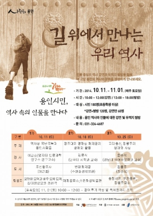 -용인역사 속 인물 강연․탐방 15일부터 180명 참가자 모집- 용인중앙도서관은 10월 11일부터 11월 1일까지 매주 토요일 공공도서관 길 위의 인문학 ‘길 위에서 만나는 우리 역사’ 프로그램을 운영하기로 하고 오는 15일부터 참가자를 모집한다. ‘공공도서관 길 위의 인문학’은 문화체육관광부 주최, 한국도서관협회 주관으로…
