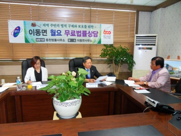 지난 7월 첫 ‘무료법률상담서비스’를 운영한 용인시 처인구 이동면이 지난 8월 18일 두 번째 상담을 진행했다. 동천법률사무소 김용숙 소장과 이기석 대표 변호사는 이날 이동면사무소 회의실에서 6명의 지역주민을 대상으로 상담했다. 주민들은 민사, 행정, 가사분쟁 분야에서 비용이나 법률지식의 한계로 해결에 어려움을 겪는 문제들을 가져왔…