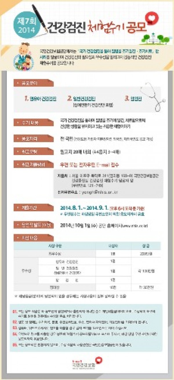 - 건강검진은 평생 건강관리의 시작입니다. 건강검진을 체험하신 분 누구나 응모 가능 - 국민건강보험공단은 국가건강검진을 통해 질병을 "조기발견하여 치료한 사례"를 발굴 전파함으로서 국민들의 건강검진참여를 확대하고 건강수준을 향상하고자 2014년 8월 1일부터 9월 1일까지『건강검진 체험 수기』를 공모한다. 공모 주제는 공단에서 실시…
