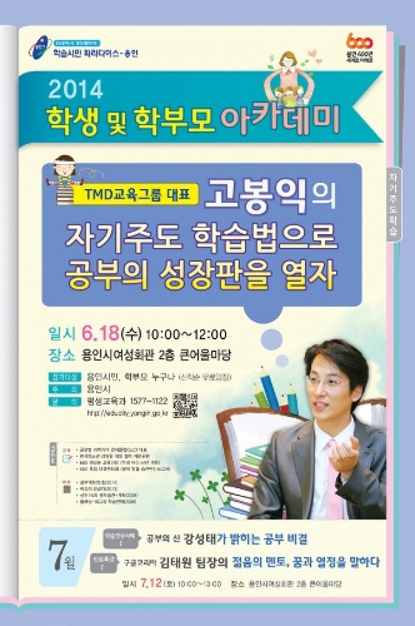 - 창의·인성 기반 자기주도적 미래형 인재 구현 용인시는 급변하는 교육환경을 이해하고, 학부모와 자녀가 함께 소통하고 공감해 창의․인성 기반의 자기주도적인 미래형 인재로 성장하는데 도움을 주고자 ‘2014년 제3회 학생 및 학부모 아카데미’를 개최한다. 이번 ‘학생 및 학부모 아카데미’에서는 TMD교육그룹 고봉익 대표를 …