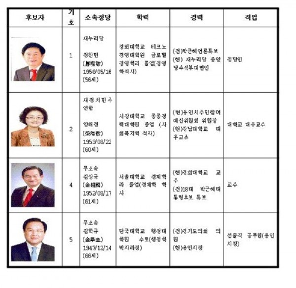 용인시 지방선거에 출마하는 후보들이 선거관리위원회에 후보등록을 완료함으로써 기호추첨을 통하여 부여받고 오는 22일부터 공식선거운동이 들어간다. 1.시장후보자 2. 도의원후보자 현황 1- 3 선거구 후보자현황 …