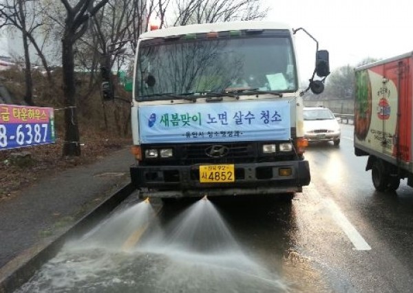 노면살수 청소차량 봄맞이 도로 물청소 나서