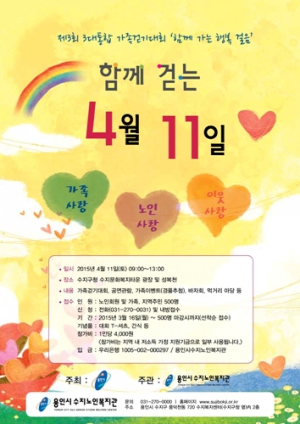 용인시수지노인복지관(관장 김현숙)은 어르신과 그 가족, 지역주민이 함께하는 3대통합 가족걷기대회를 통해 가족의 의미를 되새기고, 지역 내 어르신 공경과 나눔을 실천하고자 한다. 올해로 3회째를 맞이하는 가족걷기대회는 2015년 4월 11일(토) 오전 9시부터 진행되며, 용인시수지노인복지관 광장(수지구청 내)에서 시작하여 탄천을 따라 …