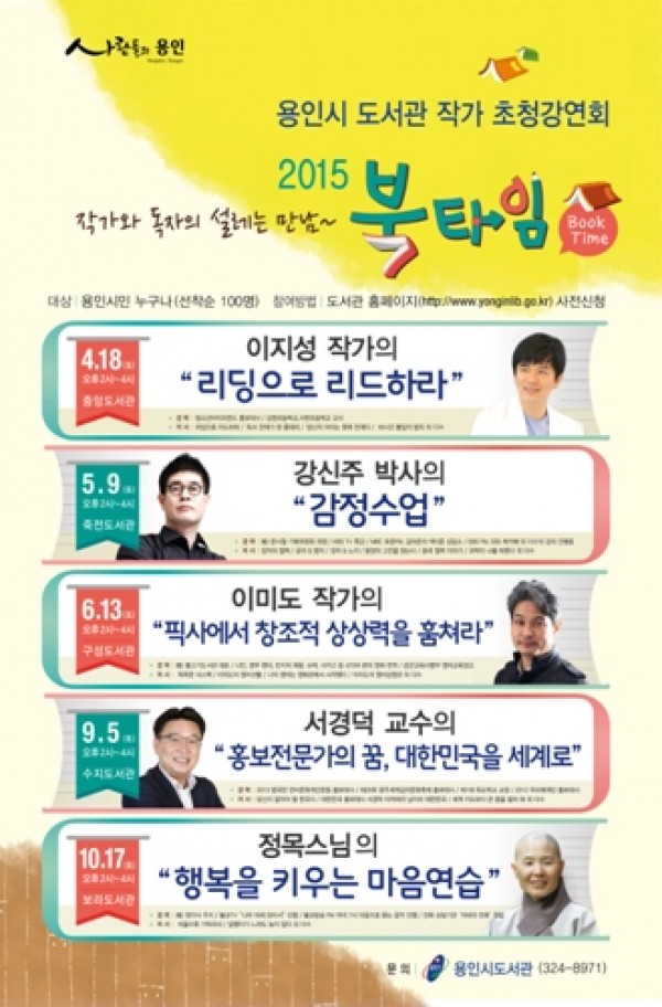 첫 강연, 4월 18일 용인중앙도서관‘리딩으로 리드하라’ 이지성 작가 용인시는 인문정신 고양과 독서 문화 확산을 위한 ‘북타임’을 운영한다고 23일 밝혔다. ‘북타임’ 행사는 작가초청강연회다. 시민들이 만나고 싶어하는 유명 저자를 초청, 책에서 다 하지 못한 이야기를 들어보는 강좌로 4월부터 10월까지 용인시 공공도서관 5개관에서 …